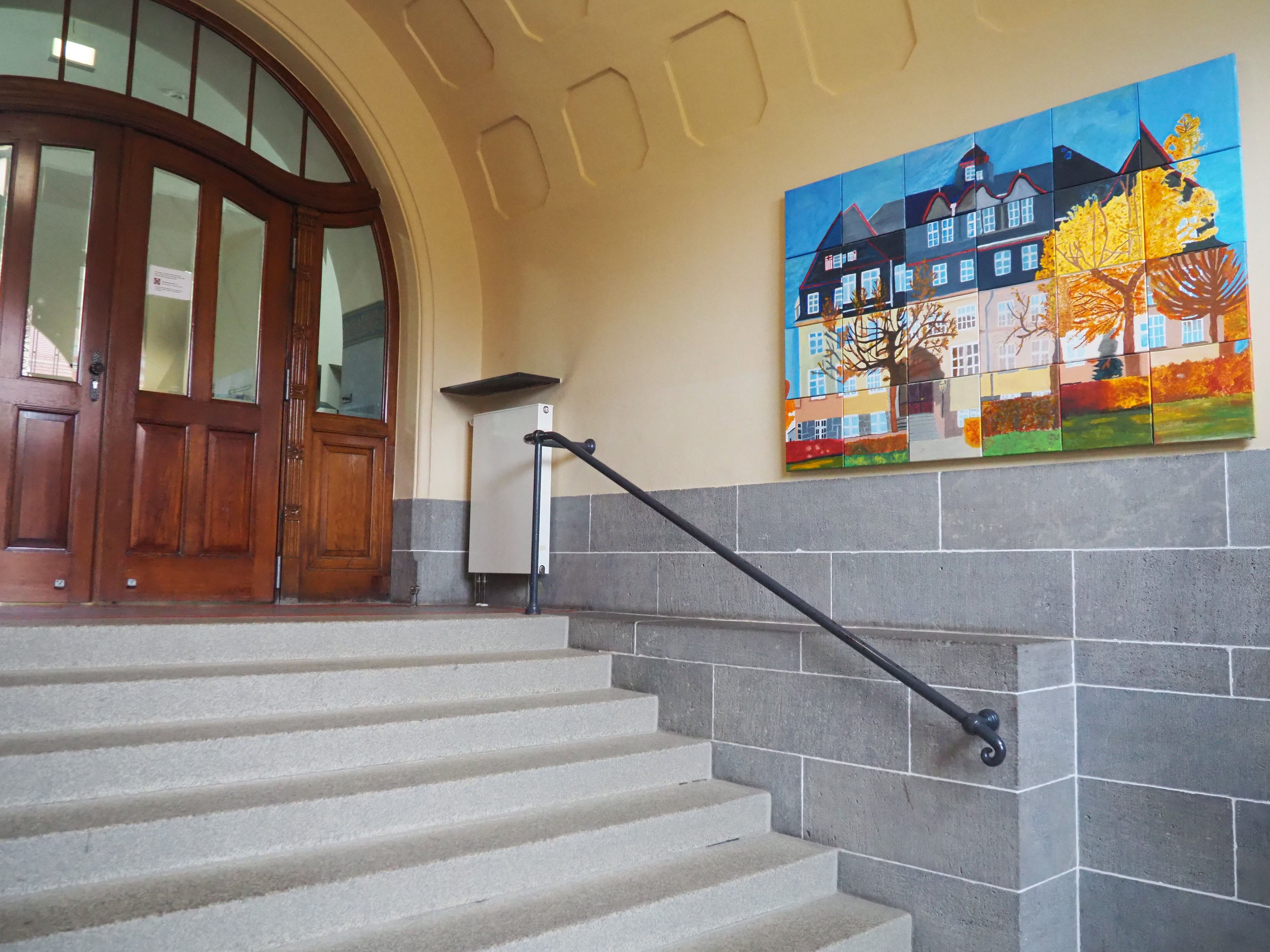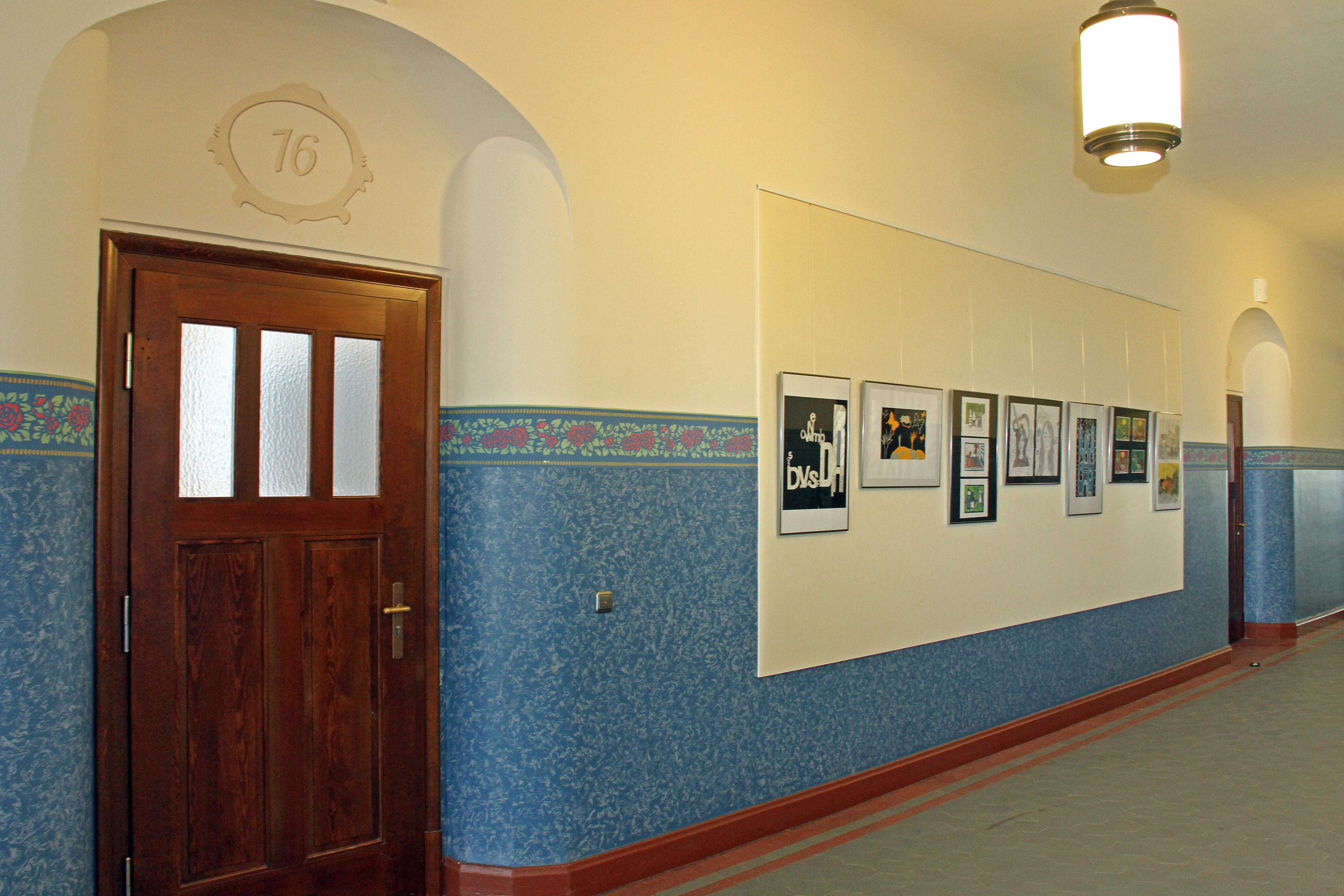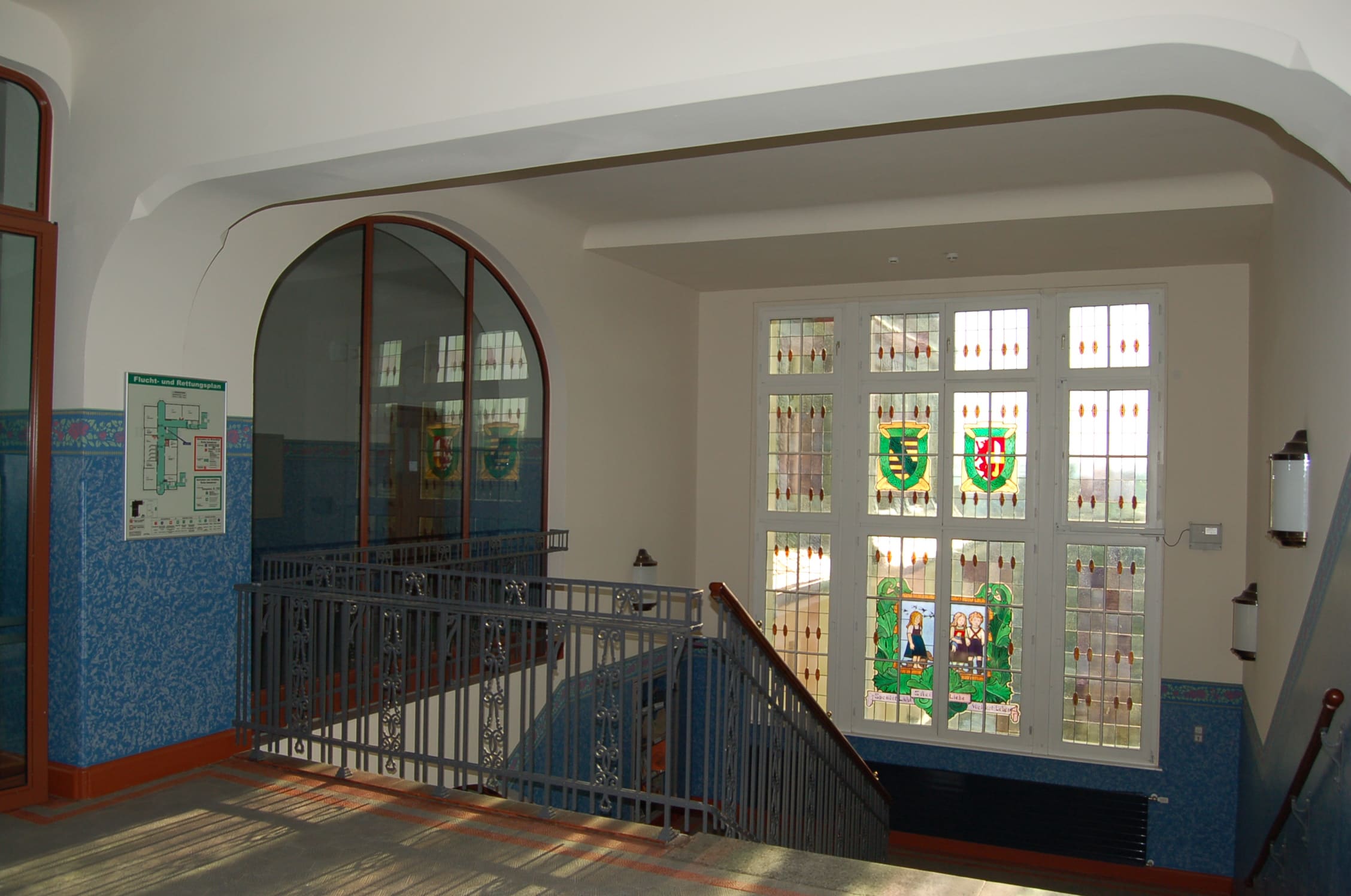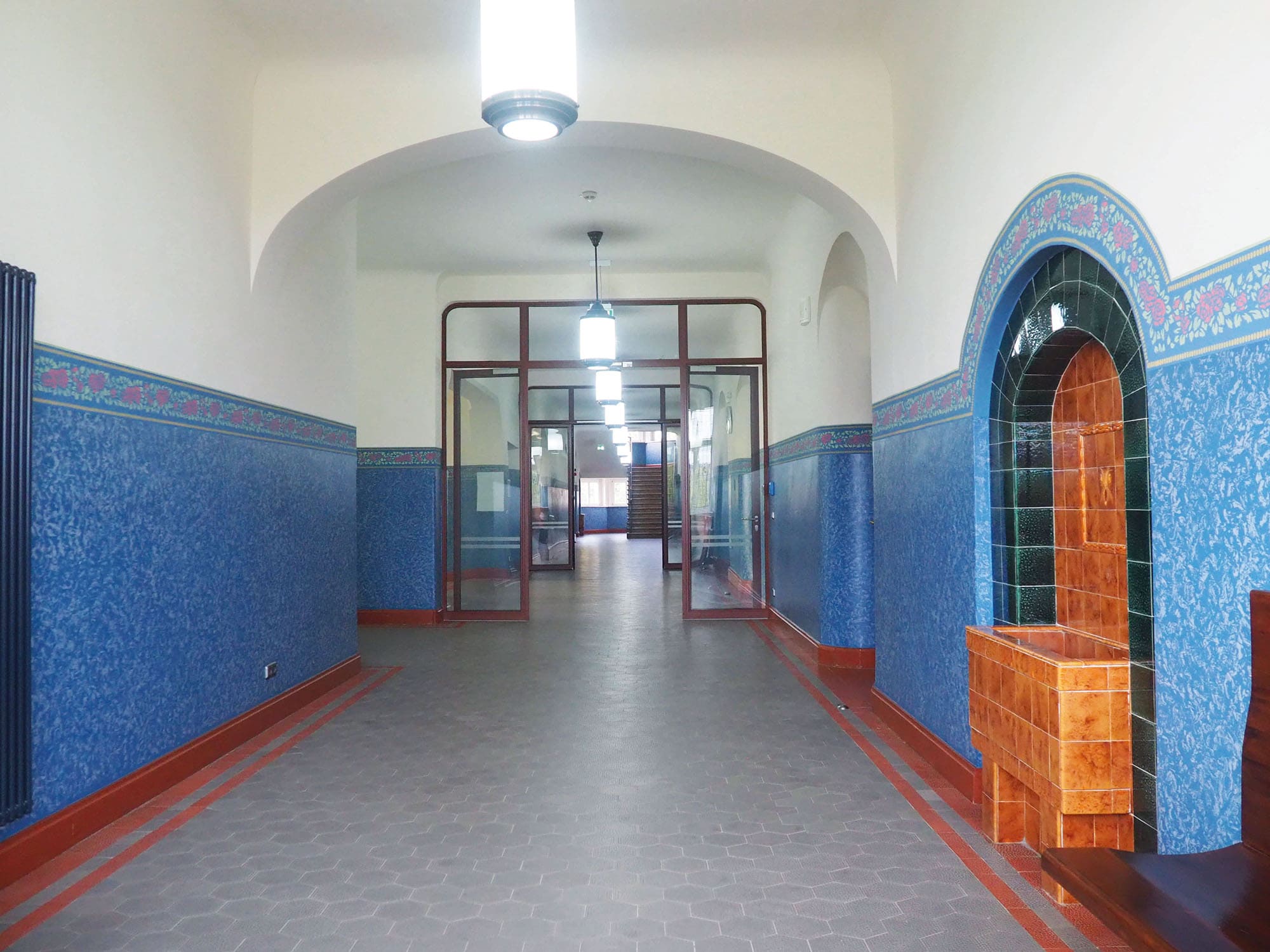 Im Zuge der Auflagen des Denkmalschutzes erfolgte die Gestaltung des Schulhauses nach restauratorischem Befund mit einer wunderschönen Wandgestaltung. Schaukästen, Vitrinen und zwei Galerien komplettieren das Schulhaus – genauso wie die notwendigen Einrichtungen zur Gewährleistung der Barrierefreiheit (Personenaufzug) und Sicherheit (rauchdichte Abschottungen).