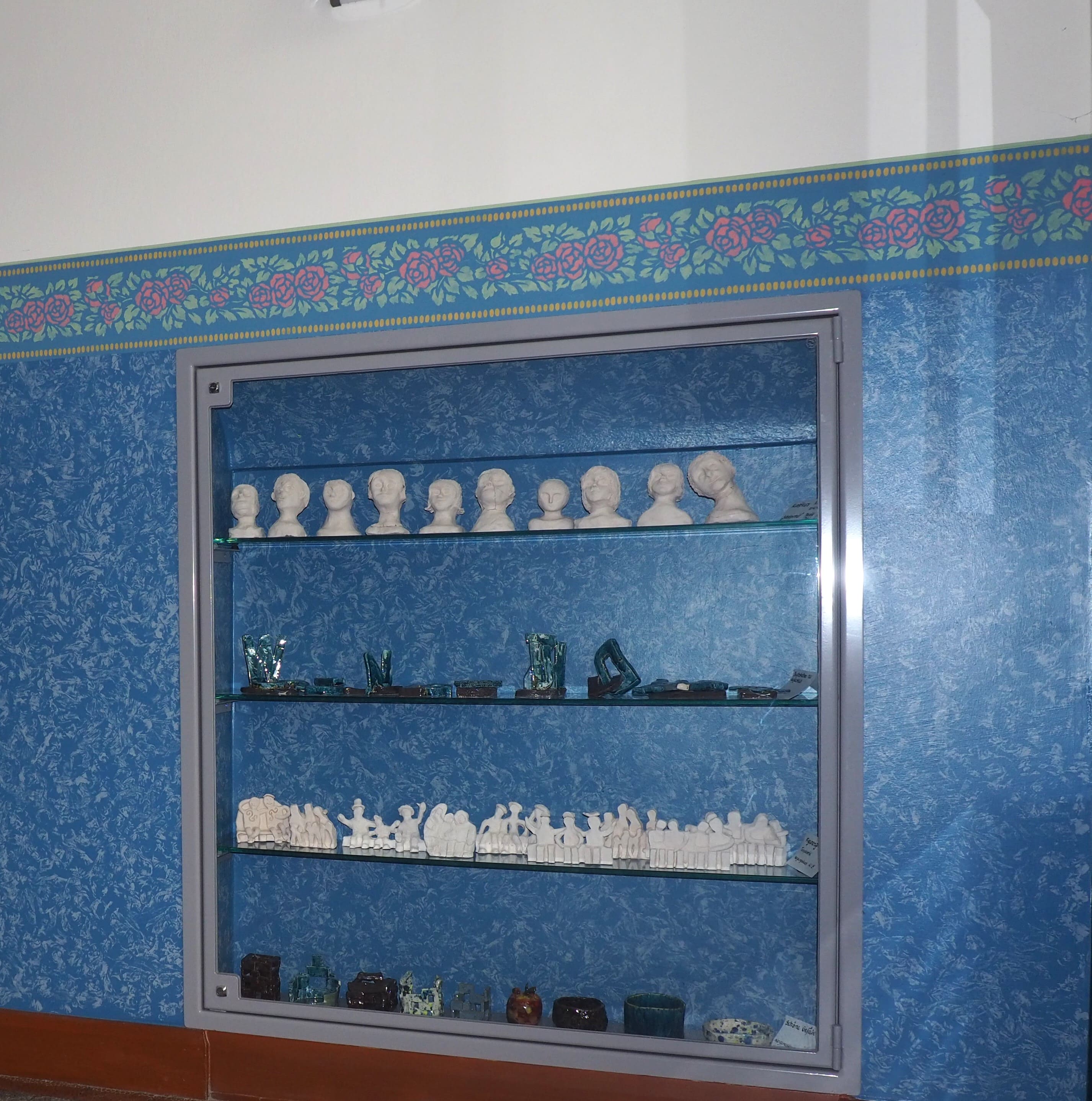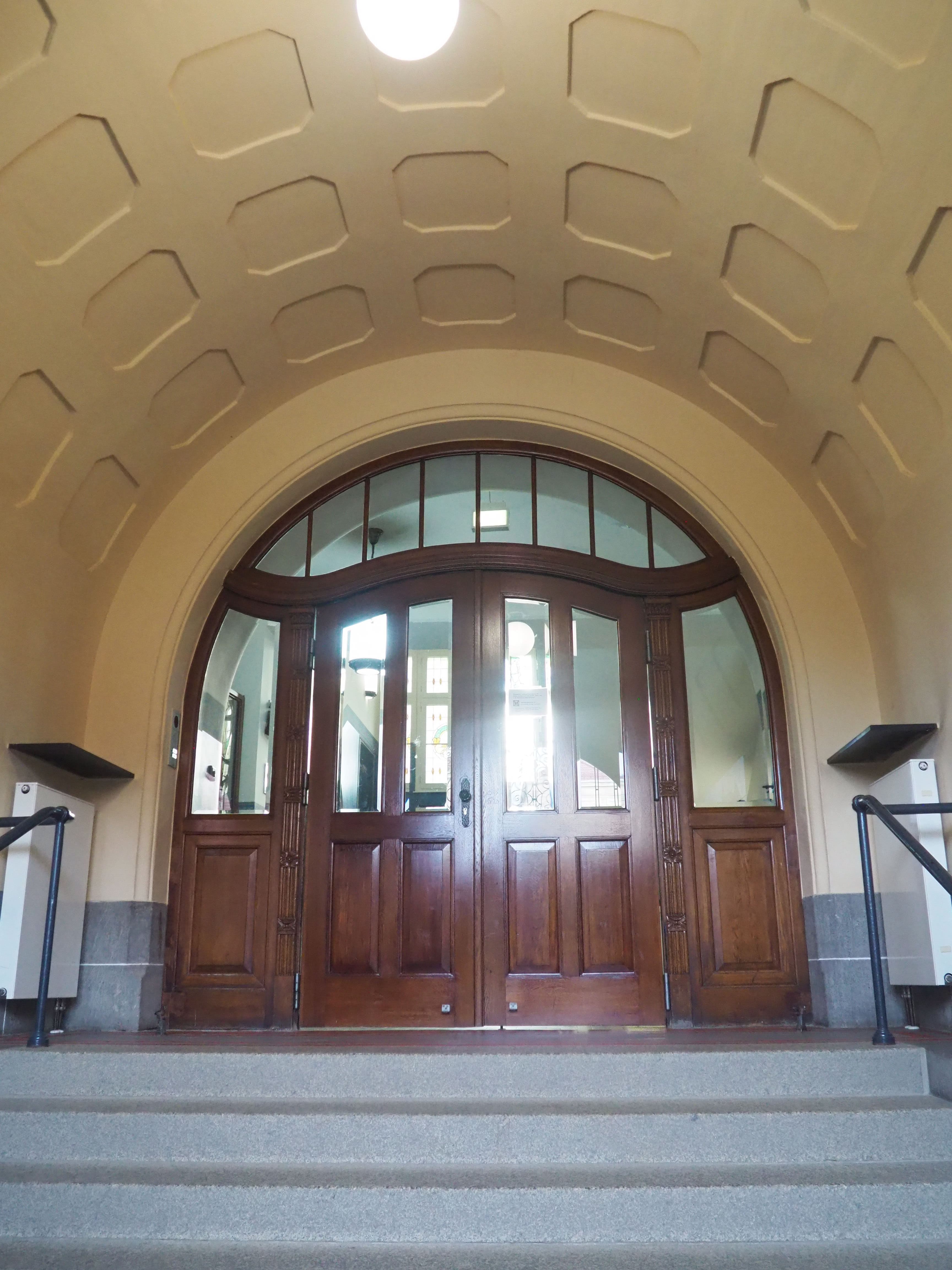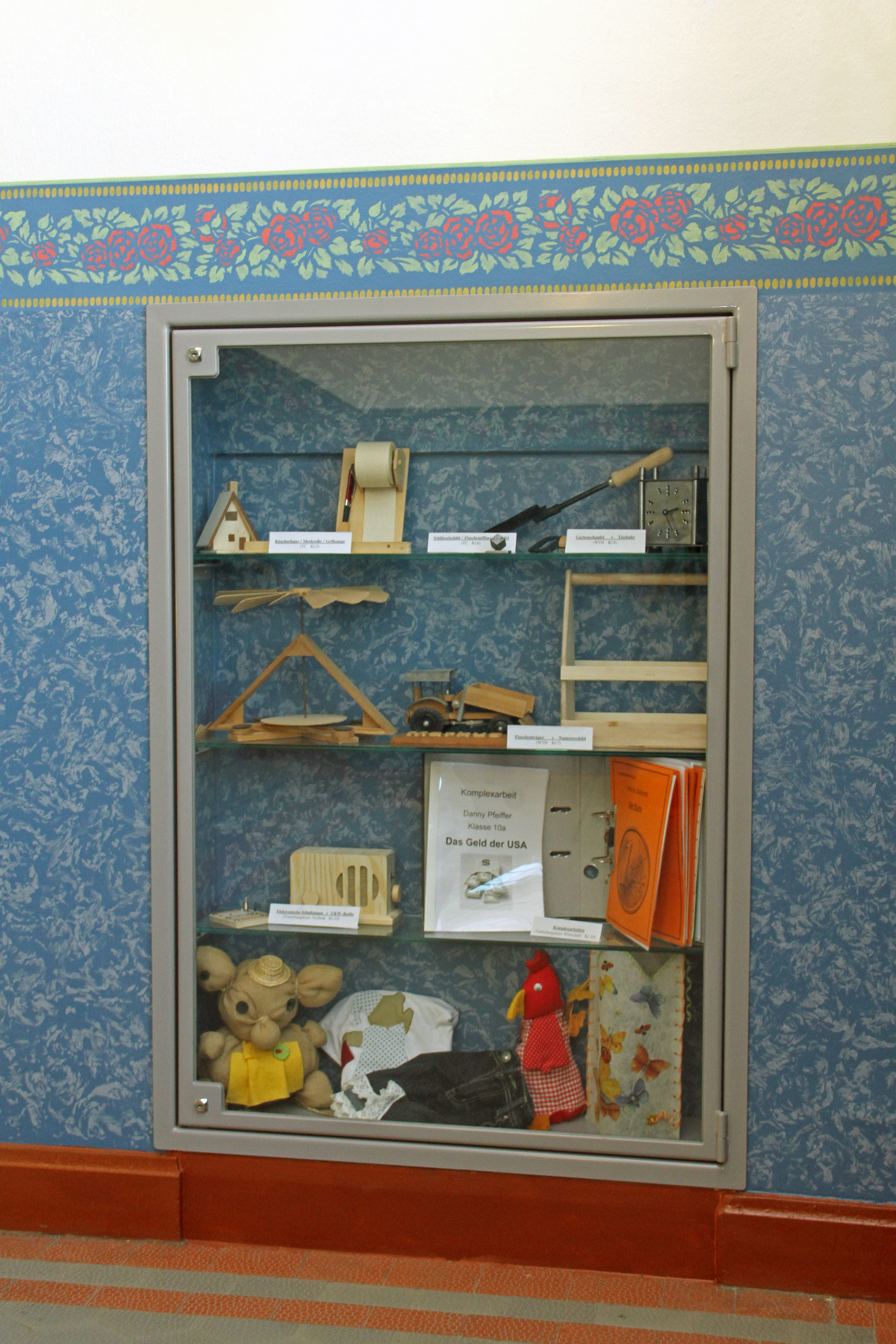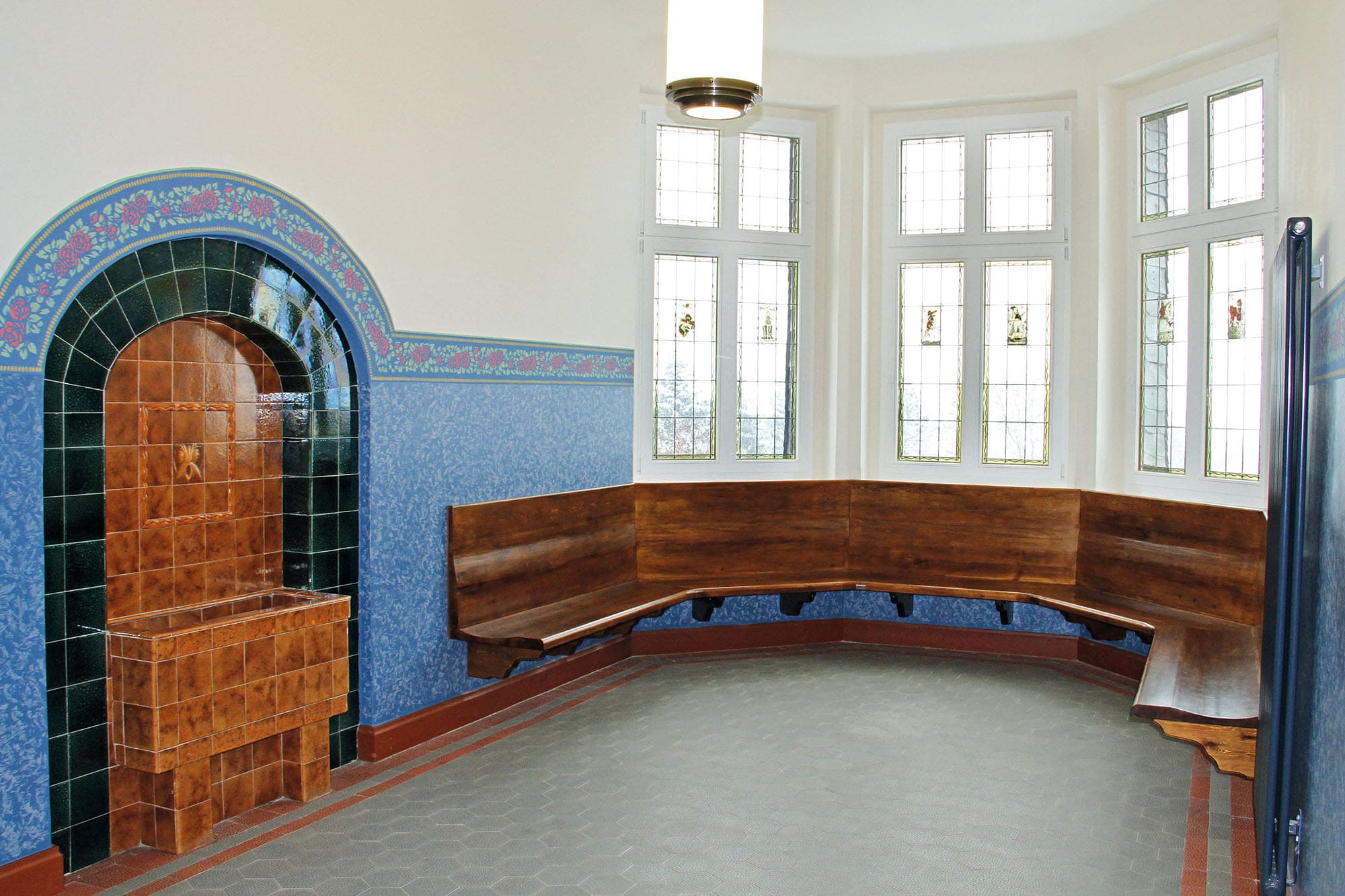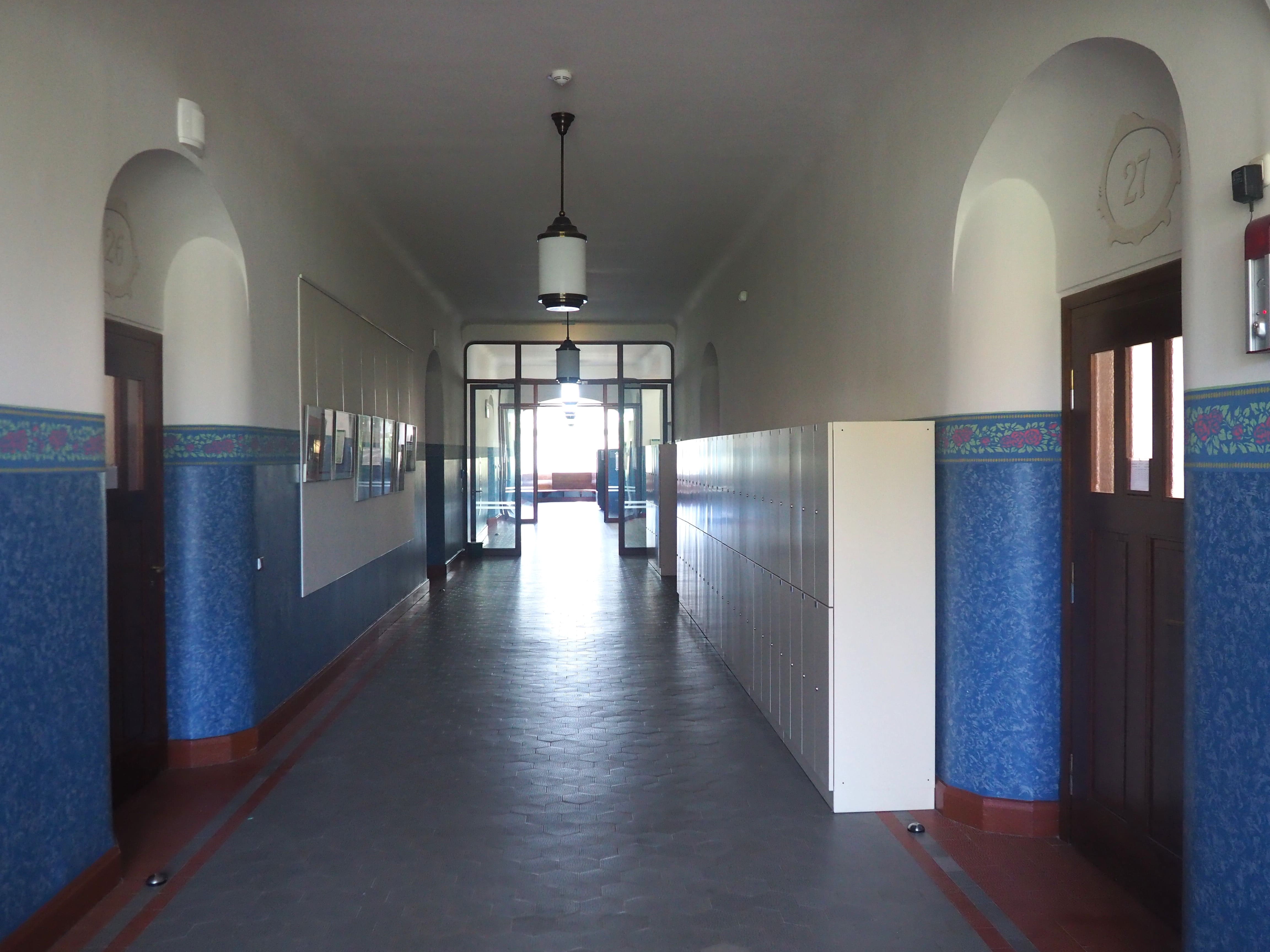 Im Zuge der Auflagen des Denkmalschutzes erfolgte die Gestaltung des Schulhauses nach restauratorischem Befund mit einer wunderschönen Wandgestaltung. Schaukästen, Vitrinen und zwei Galerien komplettieren das Schulhaus – genauso wie die notwendigen Einrichtungen zur Gewährleistung der Barrierefreiheit (Personenaufzug) und Sicherheit (rauchdichte Abschottungen).